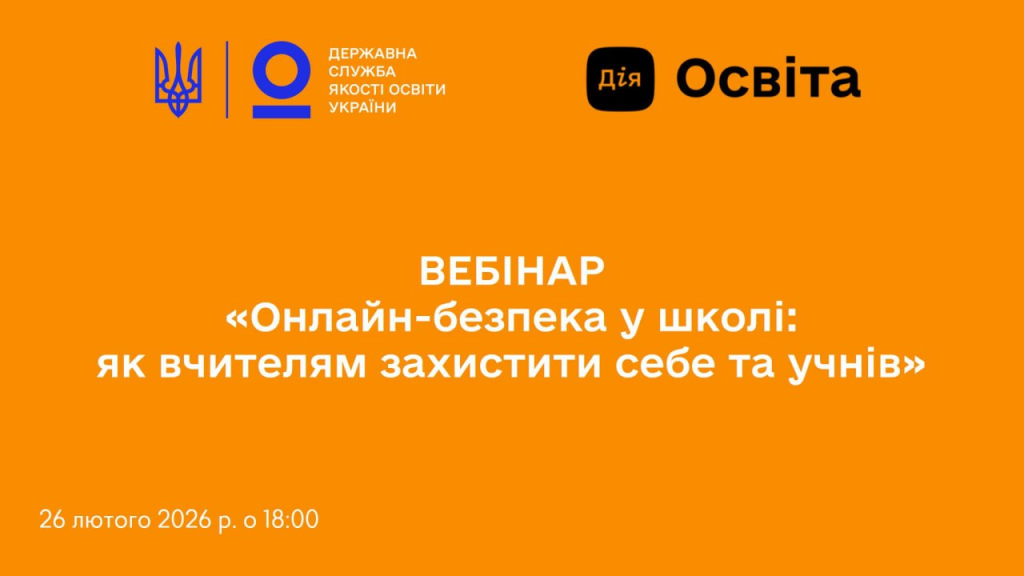 Державна служба якості освіти України підтримує ініціативу Дія.Освіта та запрошує вчителів на практичний вебінар «Онлайн-безпека у школі: як вчителям захистити себе та учнів» 26 лютого о 18:00 год.