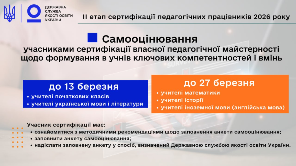 Відповідно до пункту 22 Положення Інформація про строки та спосіб надсилання учасником сертифікації результатів самооцінювання власної педагогічної майстерності оприлюднюється на офіційному веб-сайті Державної служби якості освіти та/або установи, що належить до сфери її управління, протягом трьох робочих днів з дня отримання інформації про учасників сертифікації, допущених до участі в наступному етапі сертифікації за результатами незалежного тестування.