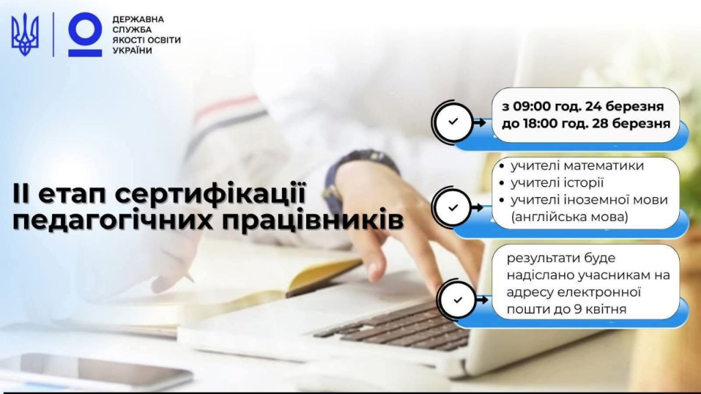 Вже вчора, 24 березня, стартував другий етап сертифікації 2026 року — самооцінювання власної педагогічної майстерності для вчителів математики, вчителів громадянської та історичної освітньої галузі та/або освітньої галузі «Суспільствознавство», вчителів іноземної мови (англійська).