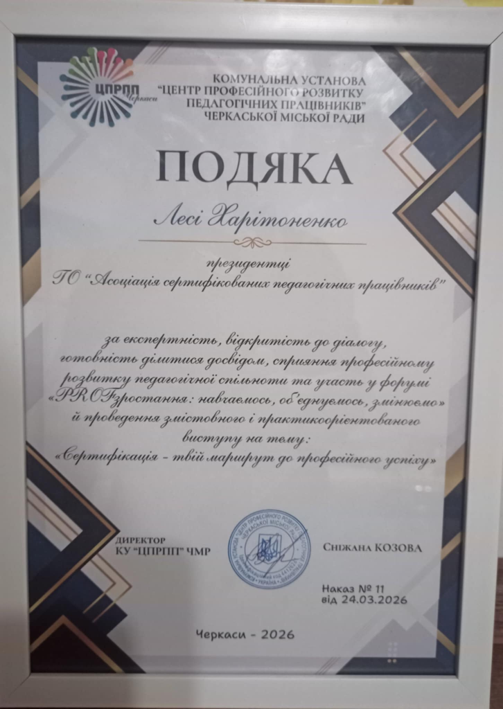 25.03.2026 року підписано меморандум про співпрацю між АСОЦІАЦІЯ СЕРТИФІКОВАНИХ ПЕДАГОГІЧНИХ ПРАЦІВНИКІВ та Центр професійного розвитку педагогічних працівників міста Черкаси. Спільні заходи для освітян Черкащини сприятимуть не лише професійному розвитку вчителів, їх фаховому становленню та визнанню педагогів і саме сертифікація є тією процедурою на рівні України. Сертифікований педагогічний працівник закладу освіти створює позитивний імідж закладу освіти, в якому працює, а разом з тим і громади.